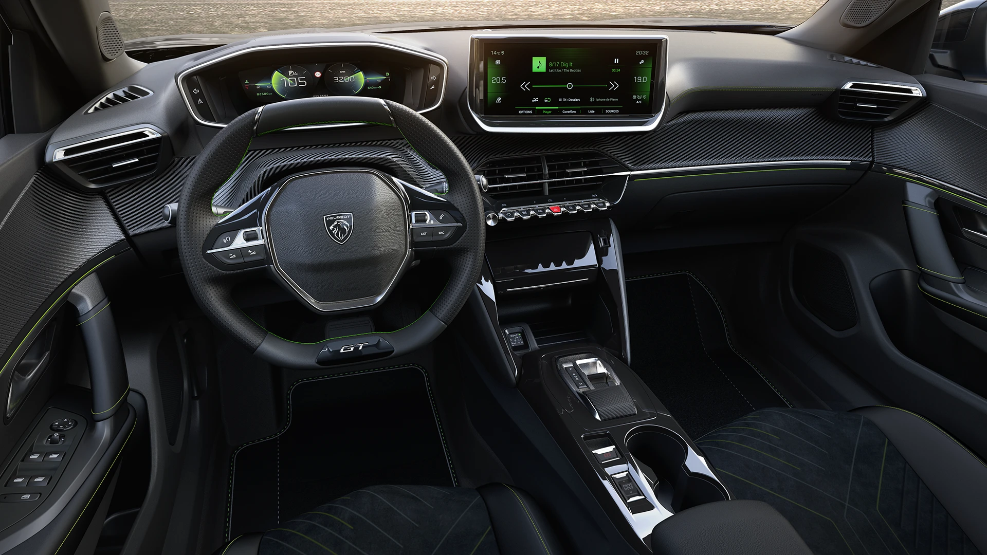 Esportividade e sofisticação únicas! O Novo Peugeot E-2008 conta com detalhes exclusivos GT: badge, costura verde no interior, tapetes bordados, pedais esportivos e o câmbio e-Toggle com 5 seletores de condução.
