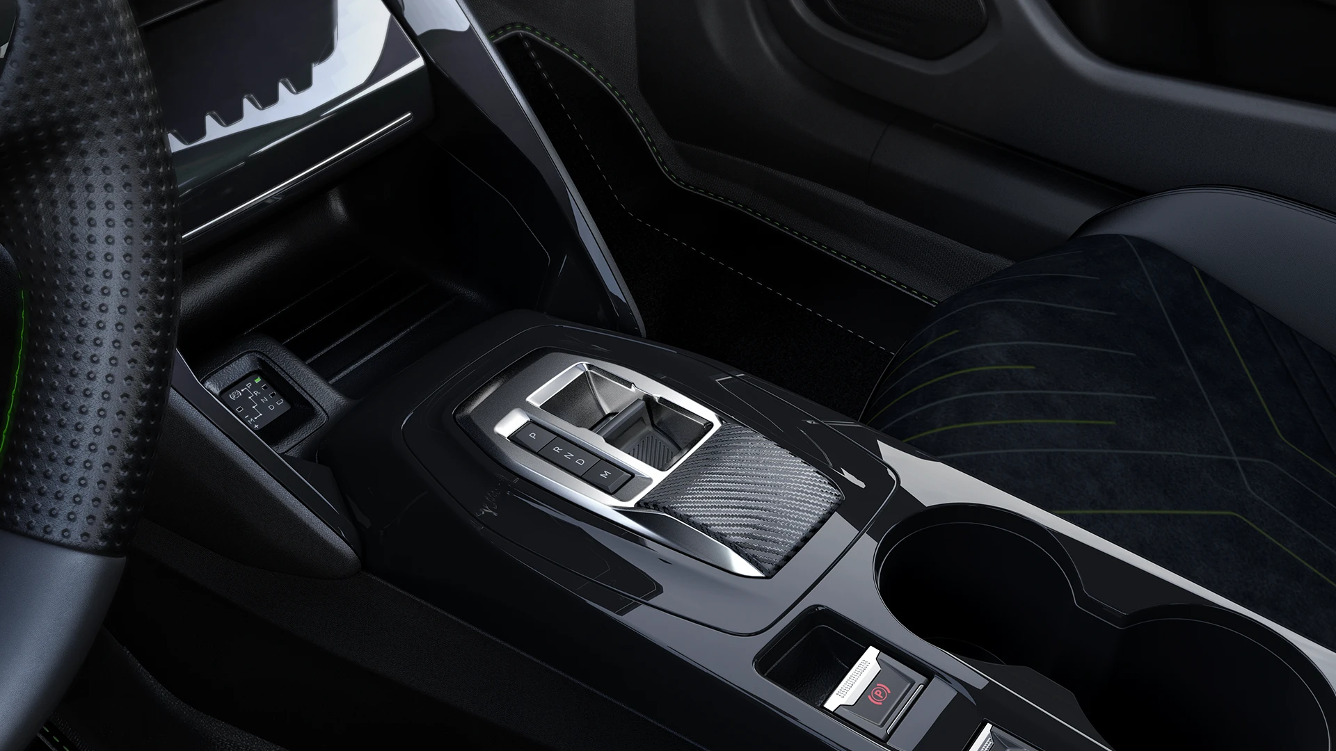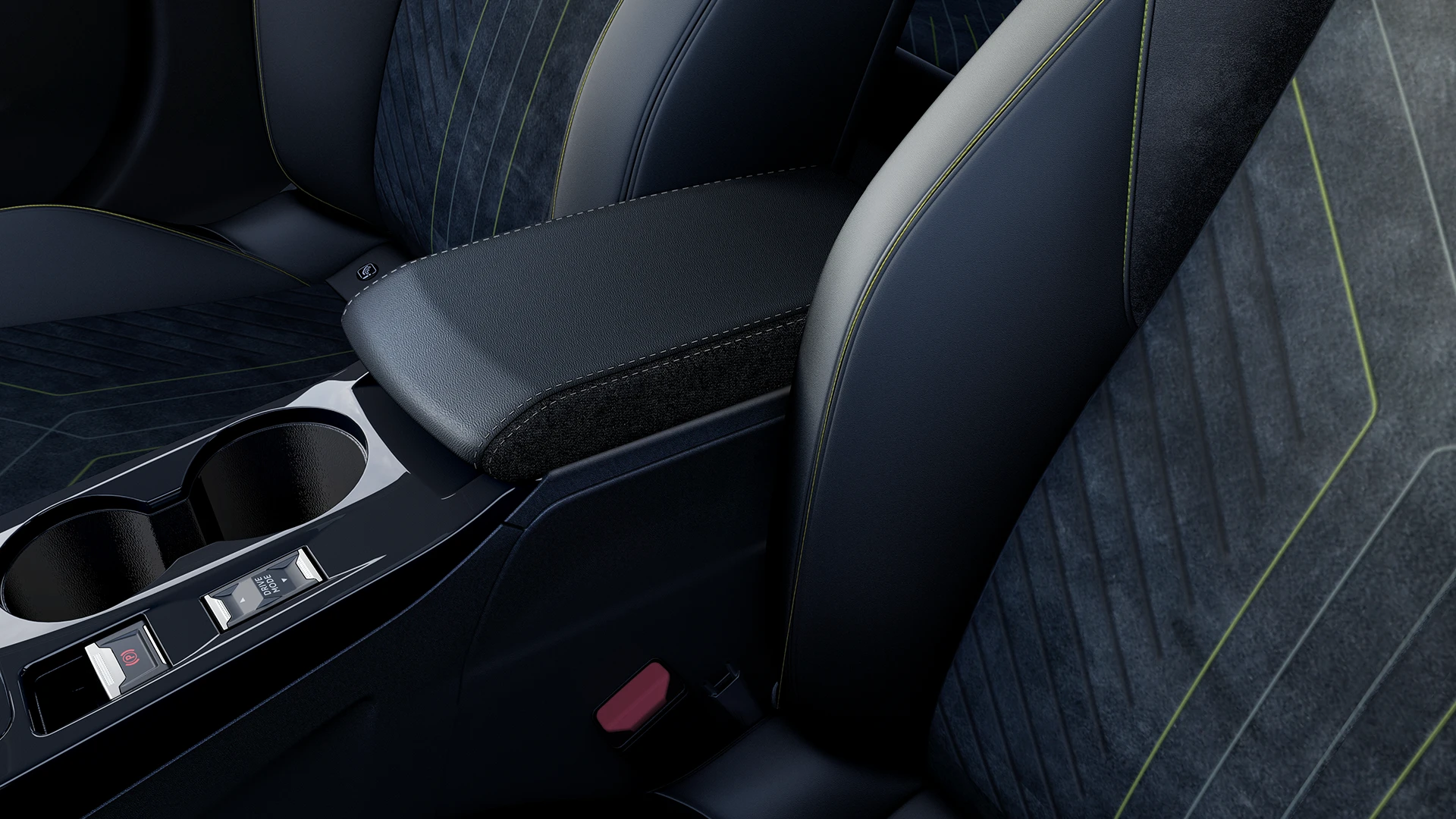 Bancos em alcantara, painel com revestimento em Soft Carbon e apoio de braços central em sintético premium.
